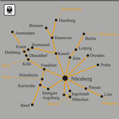 Hier sind Sie sowohl gleich in der City als auch nah am InterCity - denn mit seiner Lage direkt am Bahnhofsplatz ist unser Hotel Nürnberg nur einen Katzensprung vom Hauptbahnhof der Stadt entfernt - und ist damit nicht nur preisgünstig sondern auch besonders verkehrsgünstig gelegen. Der Bahnhofsplatz ist neben Nürnberg-Plärrer der größte Verkehrsknotenpunkt Nürnbergs. Außer der direkten Anbindung an lokale S-Bahn oder internationale Bahn-Verbindungen, ist unser Hotel auch nur eine kurze U-Bahn-Fahrt vom Flughafen Nürnberg und der Messe Nürnberg entfernt. Außerdem steht das Designhotel ganz im Zeichen des berühmten Renaissance-Malers Albrecht Dürer - genießen Sie das meisterliche Innendesign!